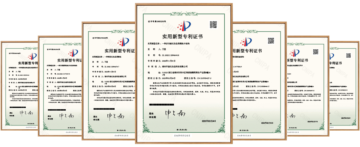 經(jīng)過多年的研發(fā)創(chuàng)新,湖州開森現(xiàn)擁有【一種便攜式散粉盒結(jié)構(gòu)】、【一種多功能化妝品易揭紙卡結(jié)構(gòu)】、【一種方便攜帶的紙卡式粉餅結(jié)構(gòu)】、【一種雙腔混合擠出型化妝品易撕包】、【一種雙腔掰折擠出型化妝品掰折打開片】、【一種單腔掰折擠出型化妝品掰折打開片證書】等多種專利,可以根據(jù)客戶的不同需求,進行深度創(chuàng)新,滿足市場和產(chǎn)品日益更新的需求。